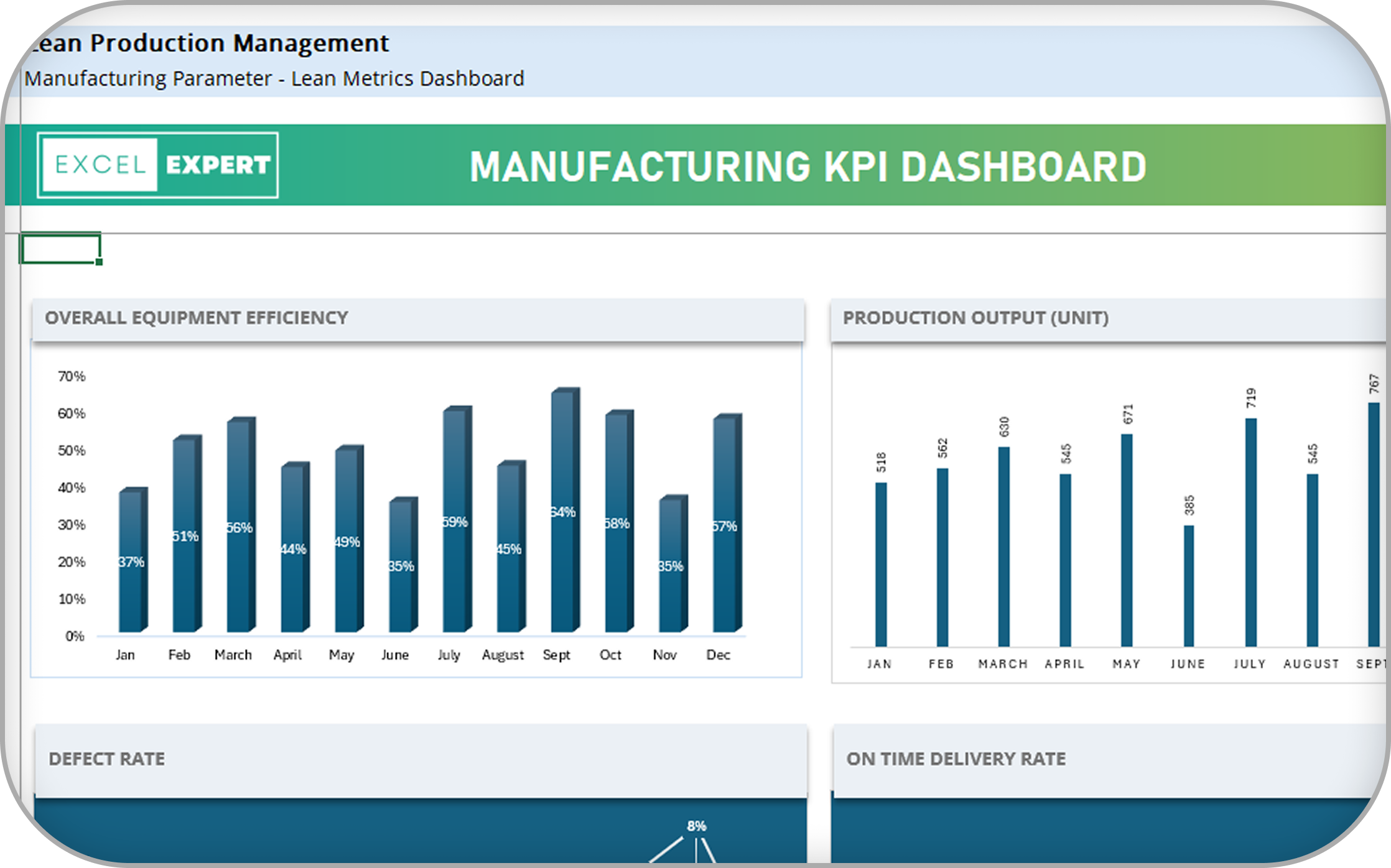 Tampilan keseluruhan untuk memantau KPI terkait Lean Production, termasuk siklus waktu, TAKT time, lead time, dan tingkat kerusakan.