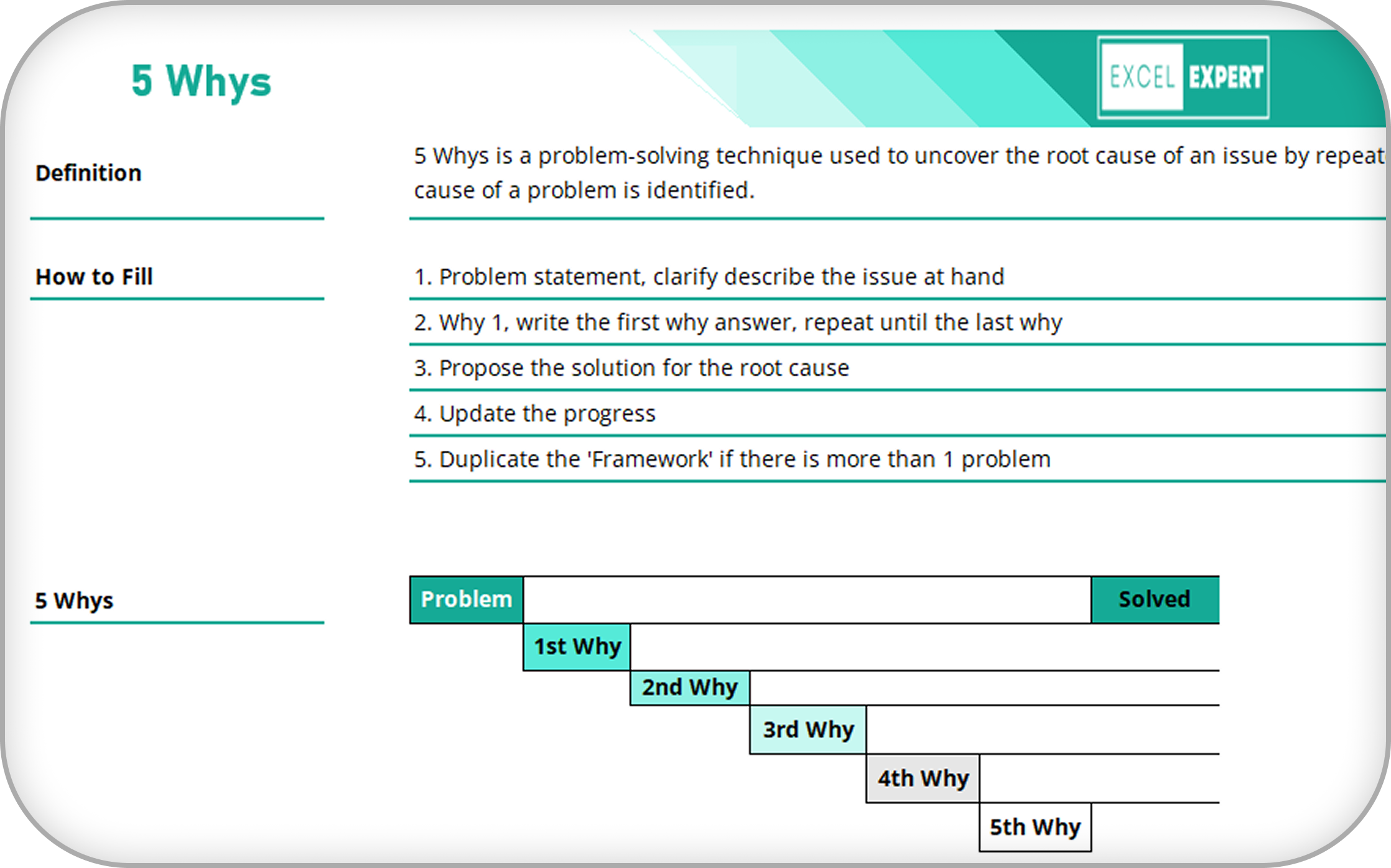 Identifikasi root cause dari suatu masalah menggunakan metode 5 Whys untuk mendapatkan masalah utama yang terjadi.